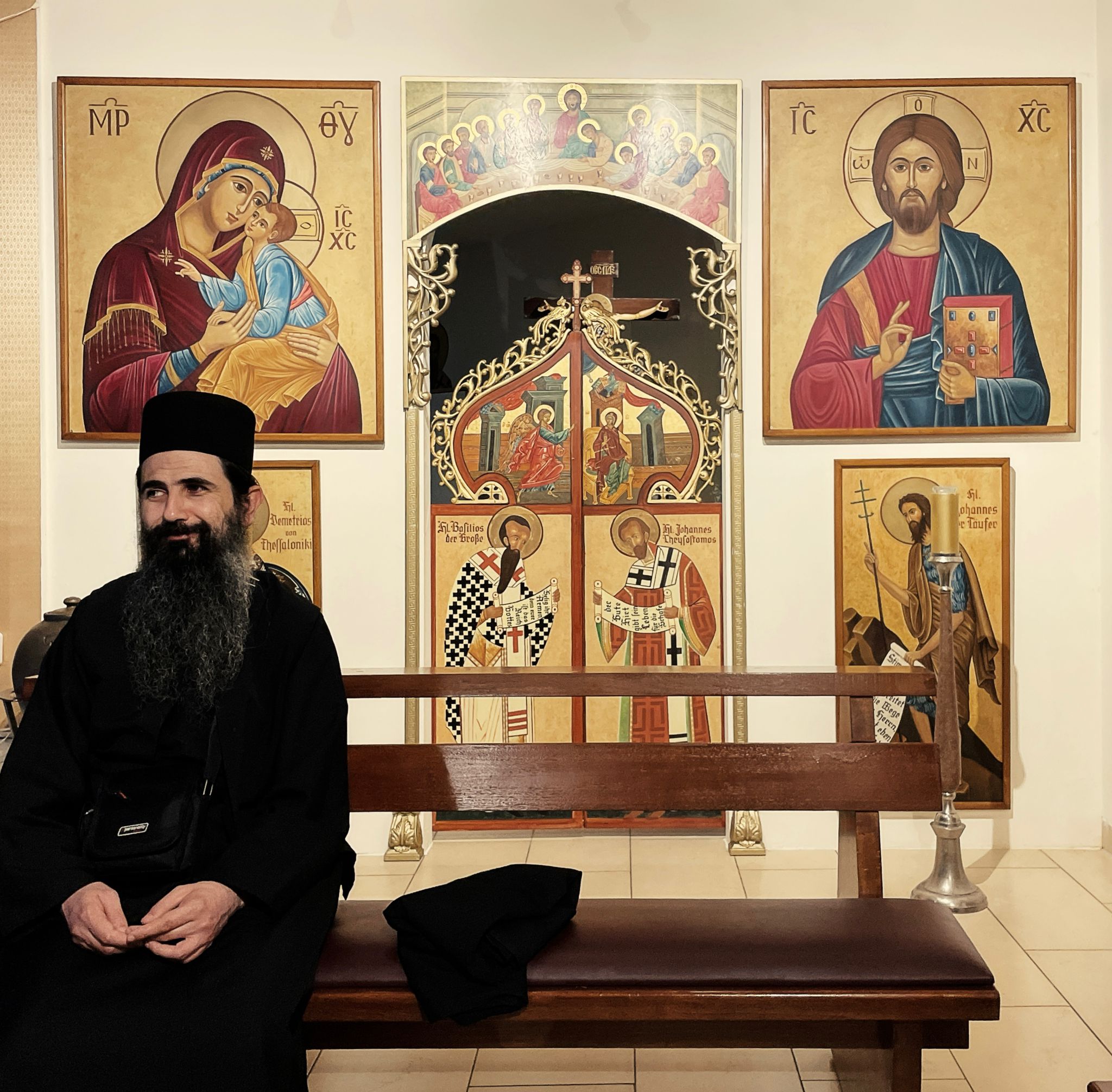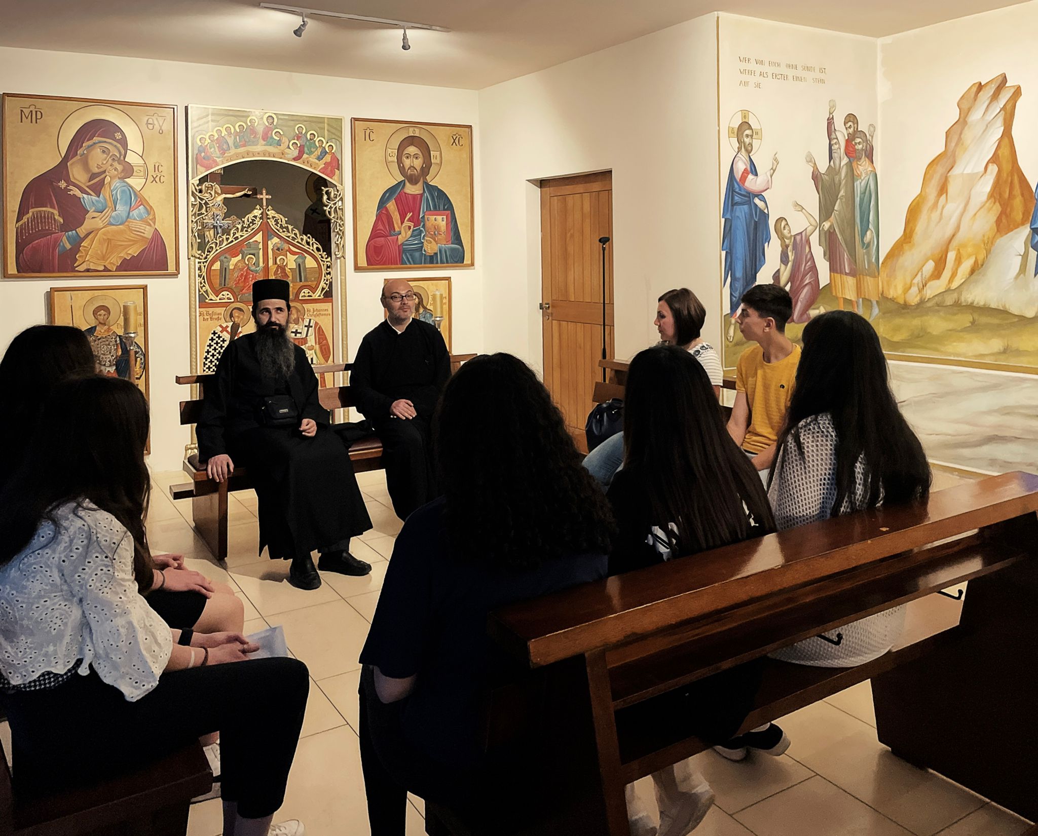 Nach dem gemeinsamen Essen, setzte sich Mönchspriester Seraphim für einen intensiveren Austausch zusammen mit den Teenagern in die Kirche.