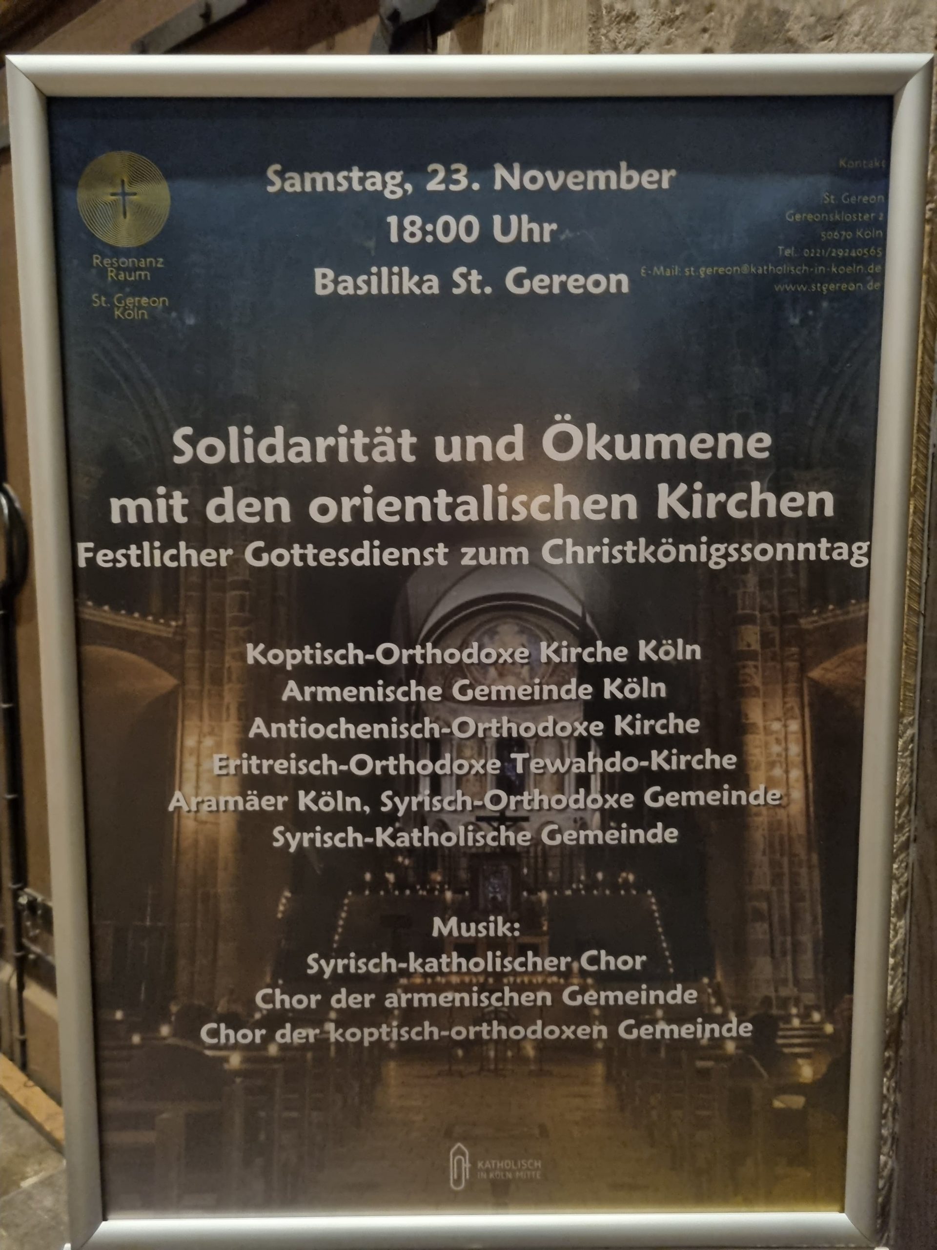 Am 23. November 2024 nahmen Vertreter der St. Dimitrios Gemeinde Köln an der Veranstaltung „Solidarität und Ökumene mit den orientalischen Kirchen“ teil, die in der Basilika St. Gereon stattfand. Die Veranstaltung begann um 18:00 Uhr und brachte verschiedene christliche Gemeinden aus der Region zusammen, um den Dialog, das Verständnis und die Solidarität zwischen den Kirchen zu fördern.